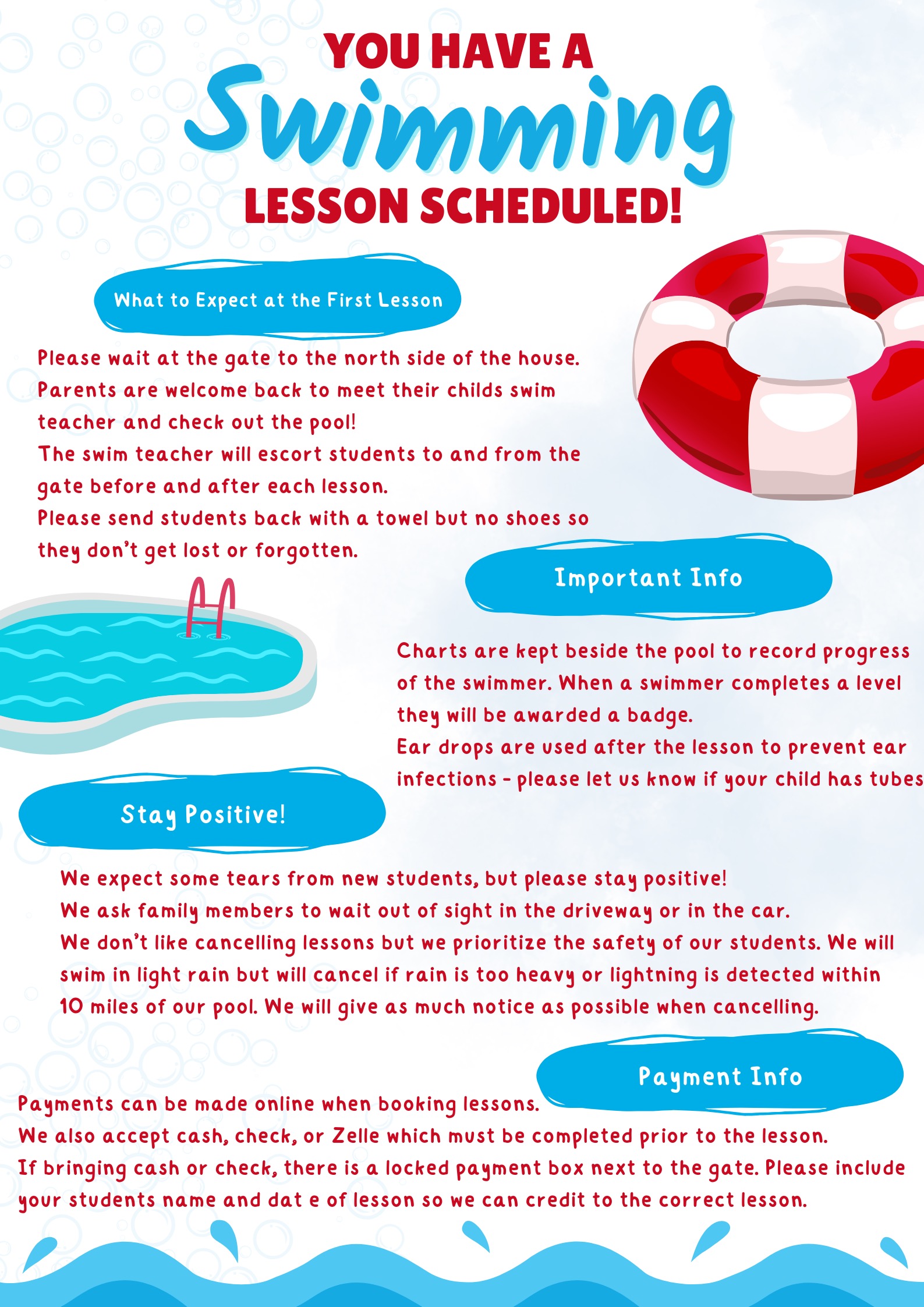 Parent accompanies student in the pool and will need to be prepared to go under the water with their child.